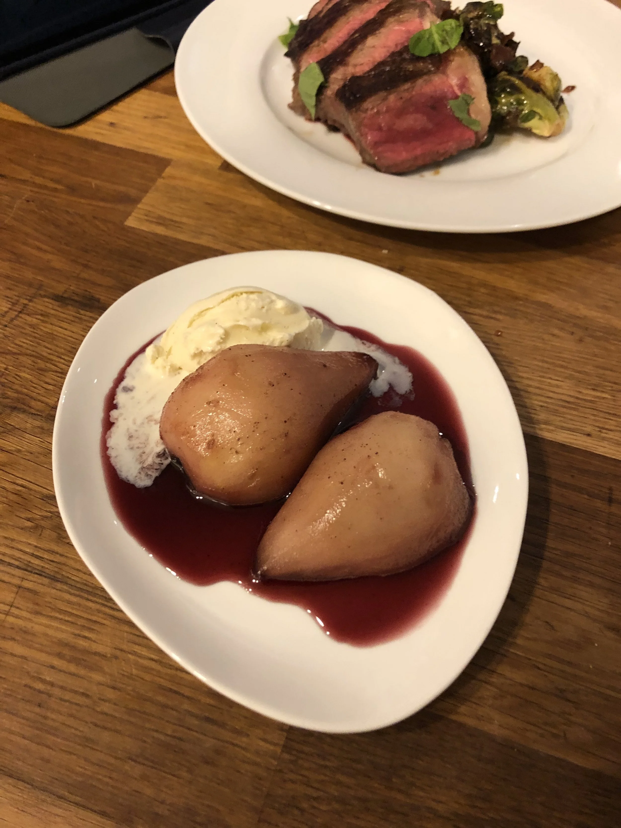 Poached Asian Pear, Mango, Crystalized Ginger, Red Wine:Sake Reduction.JPG